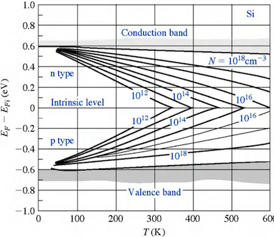 - 费米能级 ():。掺杂浓度越高,费米能级越靠近导带。