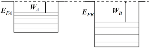 - 功函数与费米能级:在接触前,若以真空能级为零点,不同金属的功函数 不同,反映了其内部费米能级 的高低不同 (,因 可视为真空能级)。功函数小的金属,其费米能级更高。