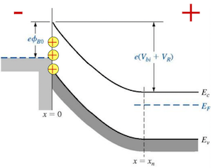 - 反向偏压 (金属接负极):半导体的能带被抬高,半导体到金属的势垒增加为 ,导带电子更难流向金属。而金属到半导体的肖特基势垒 基本不变,但电流极小。反向电流比 PN 结更大且不饱和。