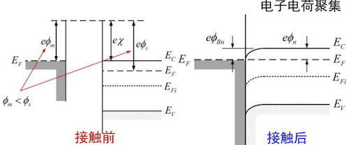 接触后,为达到统一的费米能级,电子从费米能级较高的半导体流向金属。这使得半导体界面附近因失去电子而形成一个由电离施主构成的正空间电荷区(耗尽层),能带向上弯曲,形成一个阻止电子从半导体流向金属的势垒,即内建电势 。同时,在界面处形成了一个从金属到半导体的肖特基势垒 。