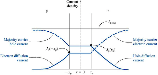 - 总电流:通过 PN 结的总电流密度为电子电流和空穴电流之和,即理想二极管方程: