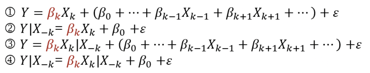 - 然后,用 Xk∣X−k 对 Y∣X−k 进行回归,得到的决定系数就是偏决定系数。