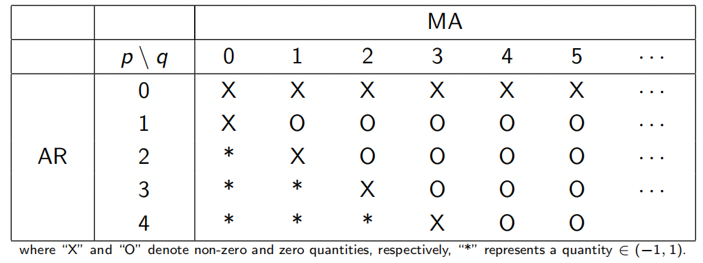 - ARMA(p,q) 模型: 采用 EACF 图,选择左上角且在其右下方向形成三角形的“圈”所对应的位置,该顶点即为 。