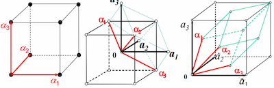 其中, 是原矢,它们是格点间平移矢量的基矢,也称为晶格基矢。