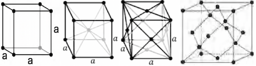 - 金刚石结构: 由面心立方单元的中心向顶角引8条对角线,在其中互不相邻的4条对角线的中点各加一个格点。每个原子有四个最近邻原子,正好位于一个正四面体的顶角位置。例如硅、锗。