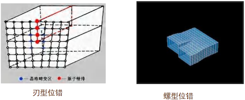 - 线缺陷: 晶体中某处有一列或若干列原子发生有规律的错排现象。最常见的线缺陷是位错,它是晶体内部局部滑移造成的。
