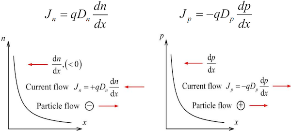 其中, 是扩散系数, 是载流子浓度梯度。负号表示扩散方向与浓度梯度方向相反。