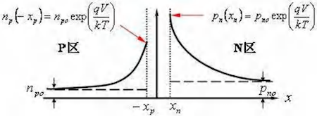 - 边界少数载流子浓度:势垒区的强电场将边界附近的少子迅速“抽取”到对面,导致边界处少子浓度趋近于零: