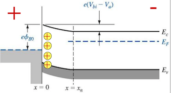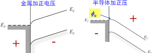 - 正向偏压 (金属接正极):半导体的能带被降低,半导体到金属的势垒减小为 ,导带电子可以轻易地越过势垒流向金属,形成较大的正向电流。