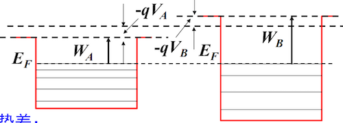 - 功函数与费米能级:在接触前,若以真空能级为零点,不同金属的功函数 不同,反映了其内部费米能级 的高低不同 (,因 可视为真空能级)。功函数小的金属,其费米能级更高。