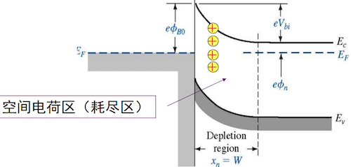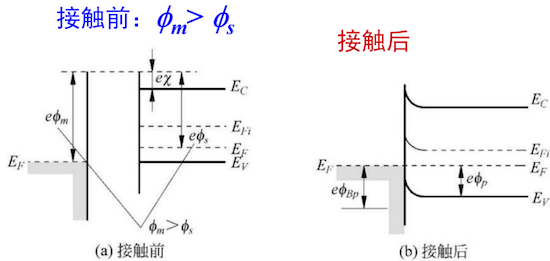 接触后,为达到统一的费米能级,电子从费米能级较高的半导体流向金属。这使得半导体界面附近因失去电子而形成一个由电离施主构成的正空间电荷区(耗尽层),能带向上弯曲,形成一个阻止电子从半导体流向金属的势垒,即内建电势 。同时,在界面处形成了一个从金属到半导体的肖特基势垒 。