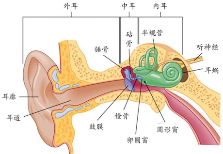 - 中耳:位于外耳和内耳之间的空腔,由三块小骨组成,负责放大鼓膜的振动并传递到内耳。