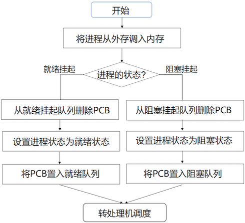 - 作用: 实现进程从就绪挂起/阻塞挂起状态到就绪/阻塞状态的转换。