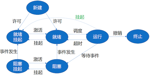 - 就绪 → 就绪挂起: 存在高优先级阻塞进程,需挂起低优先级就绪进程。